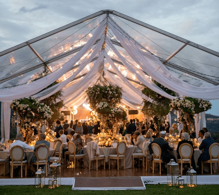 Madame Sunshine or the Sky Fairy won’t help—weather can be unpredictable. That’s why tents are crucial. They protect against sun, rain, and wind while creating a cozy space for guests.